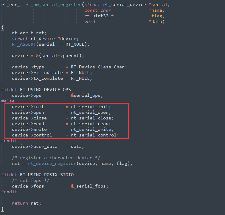 为例,首先将传入的设备驱动结构体指针强转成了串口设备驱动结构体指针,然后直接调用了串口设备驱动结构体中的接口。