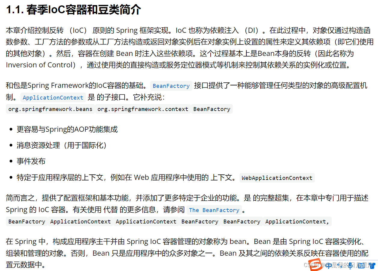 我们看SpringFramework的参考文档,优先看它的核心的内容,我本人使用的是Edge浏览器,自带的有翻译功能,我就将网页翻译成了中文版。下面是核心内容所在的网页链接: