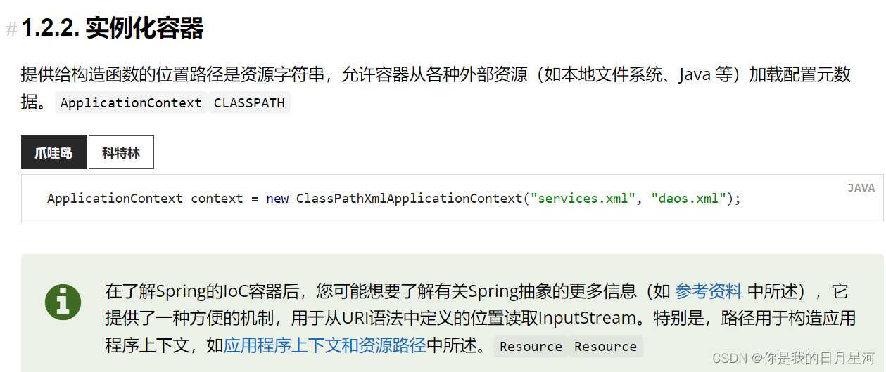 3、看官网参考文档—–实例化容器(或者说配置文件和实体类我们都写齐全了,怎么组装到一起,让它们起作用,运行起来?)
