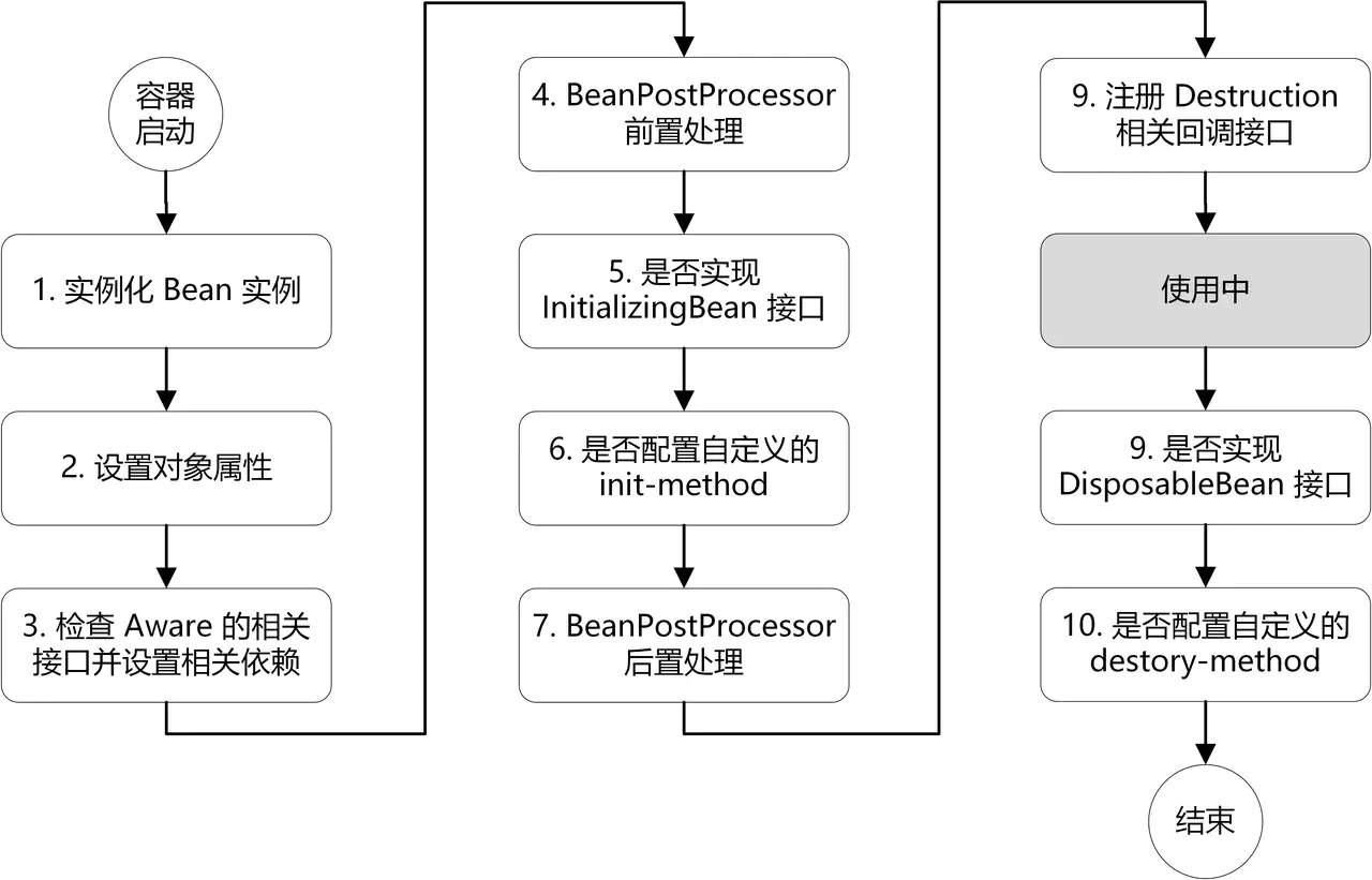 - 销毁:第 8~10步,第8步不是真正意义上的销毁(还没使用呢),而是先在使用前注册了销毁的相关调用接口,为了后面第9、10步真正销毁 bean 时再执行相应的方法。