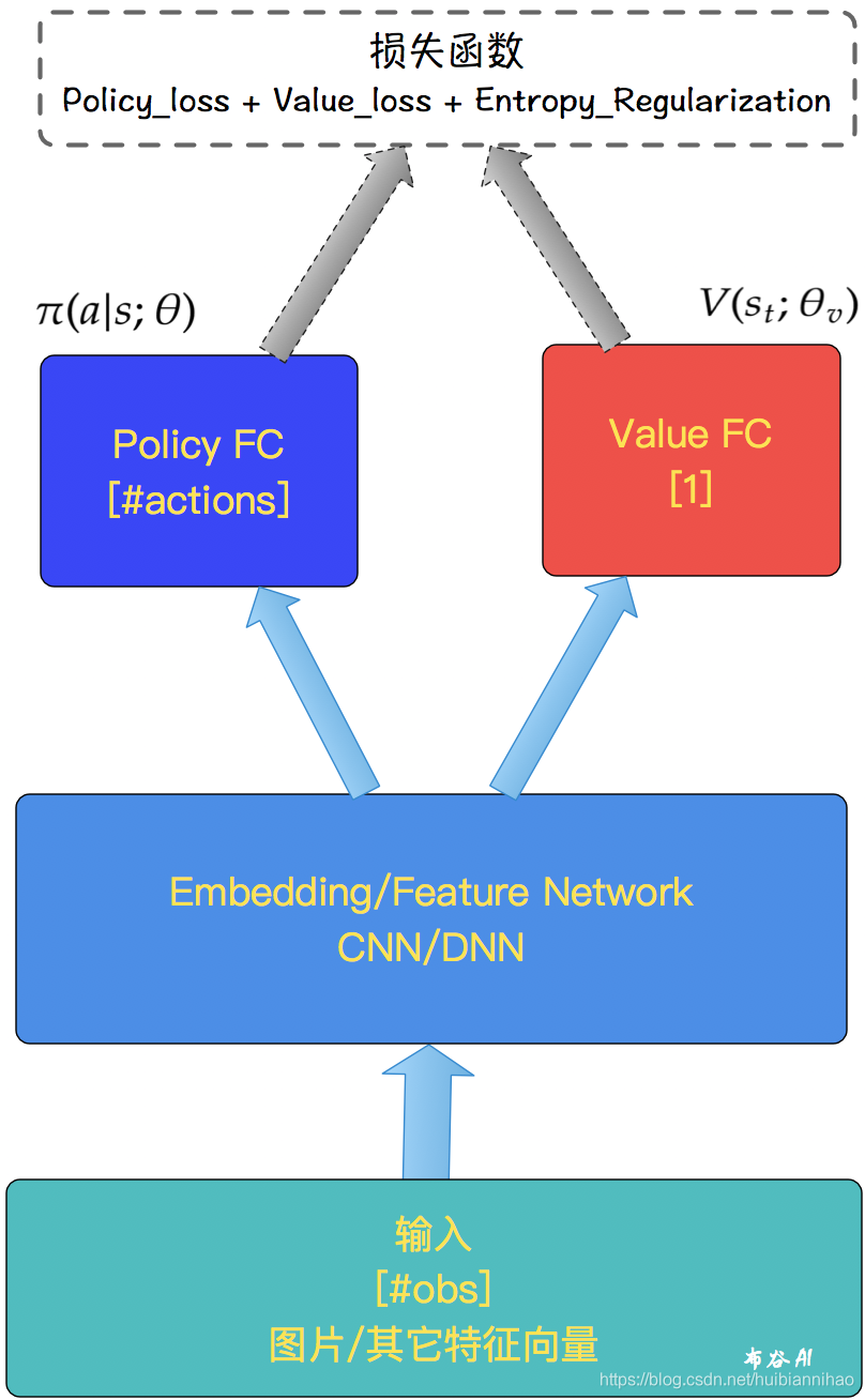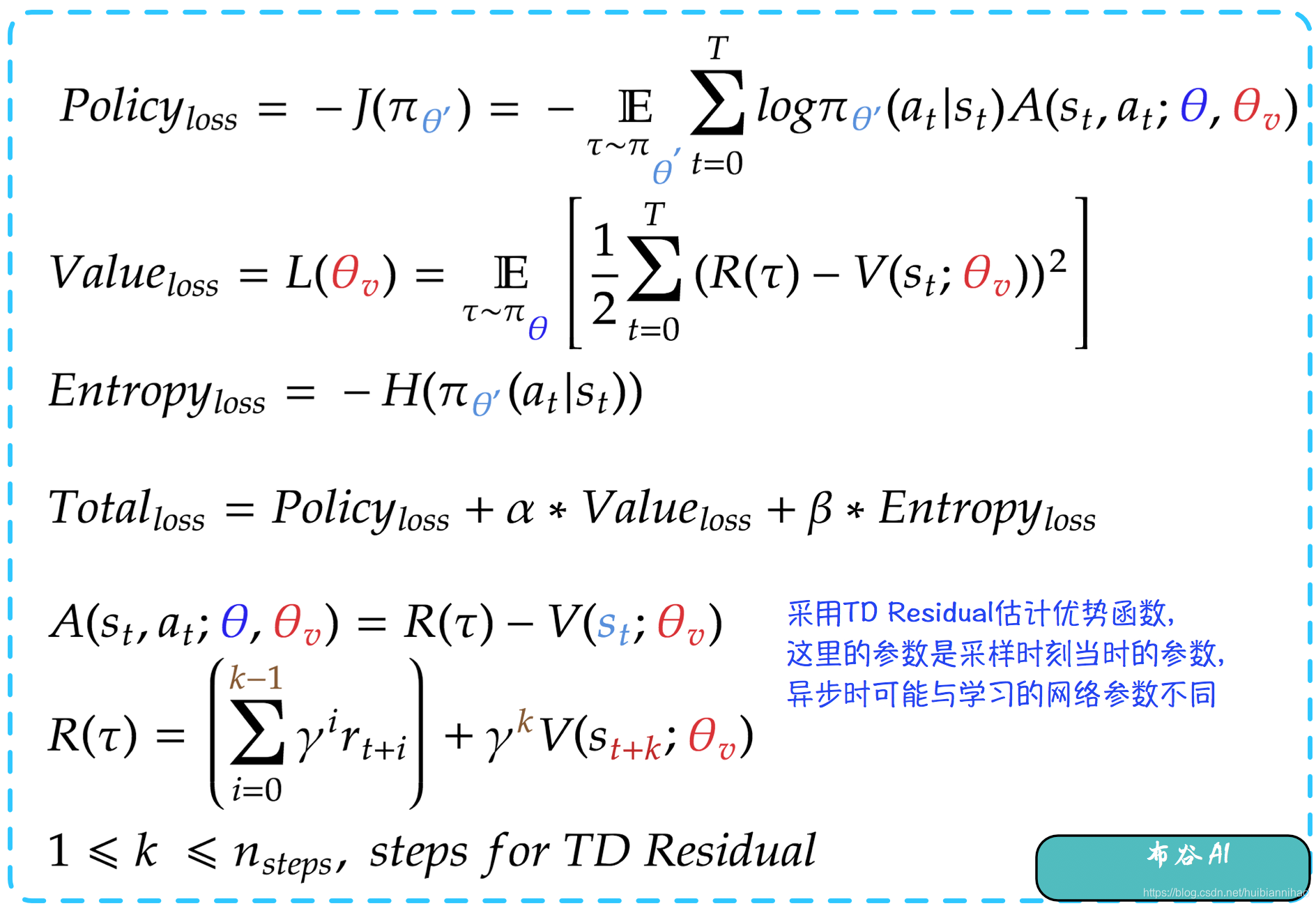 同时,可以看到,A2C的统一学习和A3C每个Worker的训练学习,采样数据的Policy与当前学习的Policy参数是一致的,即