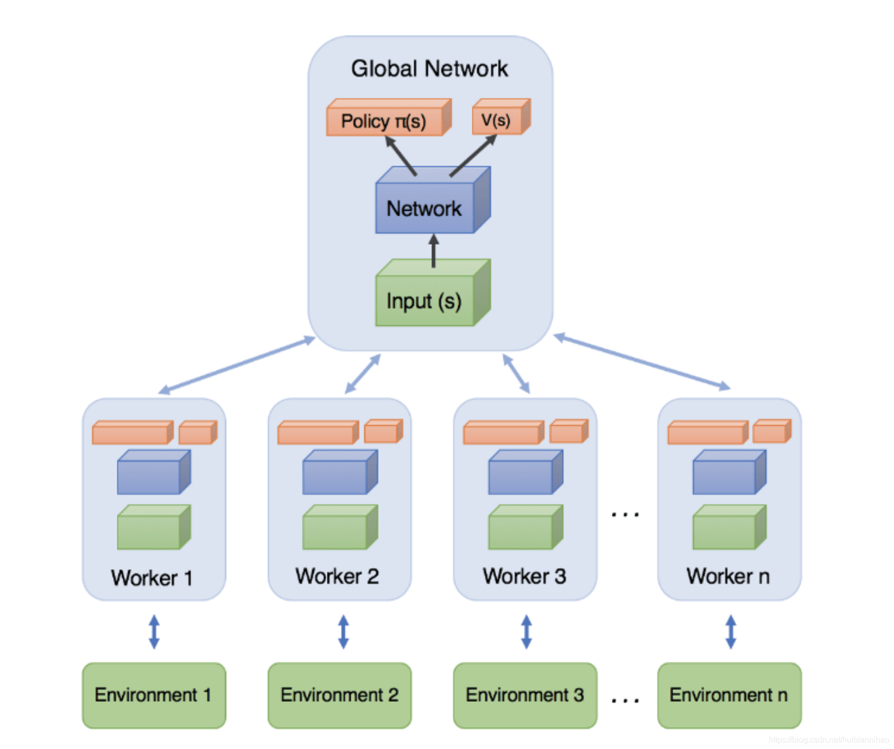 开启多个线程(Worker),从Global Network同步最新的网络参数;
