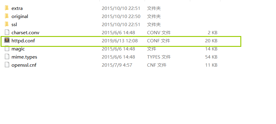 打开conf文件夹后出现如下页面,打开httpd.conf文件,可以用记事本打开,我这里是使用sublime编辑器。