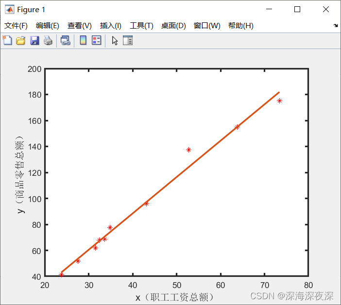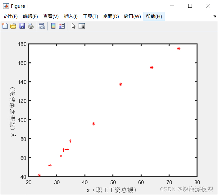 xlabel('x(职工工资总额)','fontsize', 12) %横坐标名