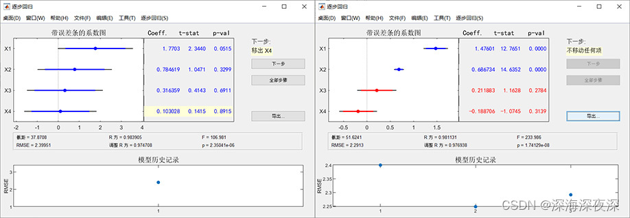 蓝色行显示变量 X1、X2、X3、X4 均保留在模型中,窗口的右侧按钮上方提示:移除X4,单击下一步按钮,剔除的变量 X3 所对应的行用红色表示,同时又得到提示:移除X3,单击下一步按钮,这样一直重复操作,直到 “下一步” 按钮变灰,表明逐步回归结束,此时得到的模型即为逐步回归最终的结果。