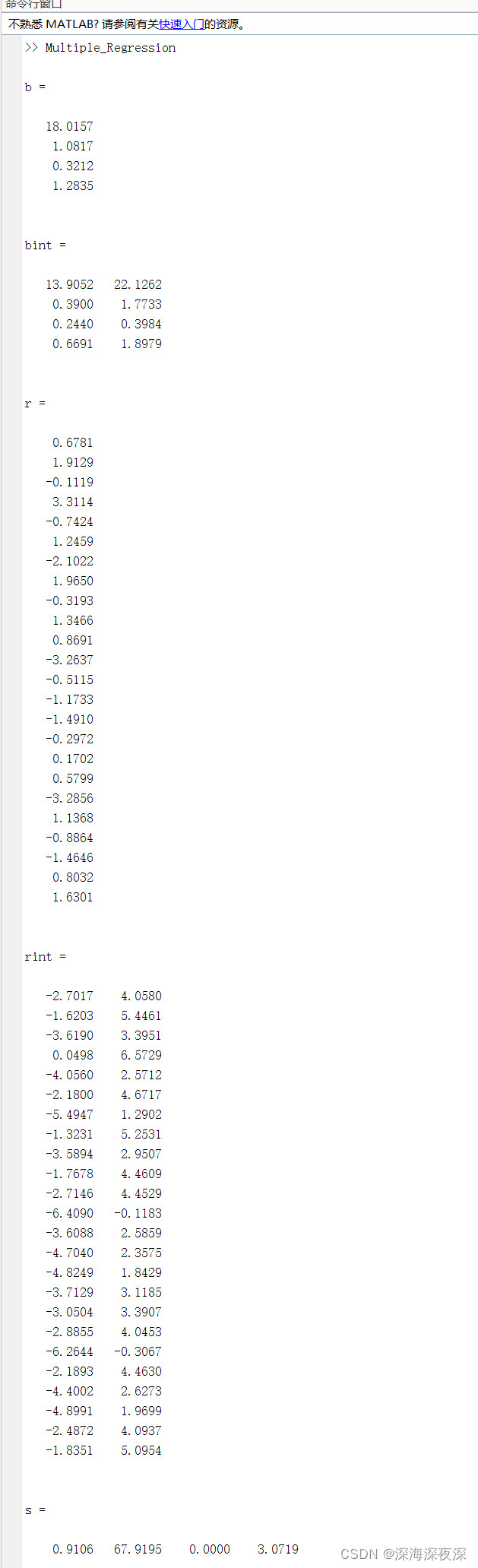 [b,bint,r,rint,s]=regress(Y',X,0.05)