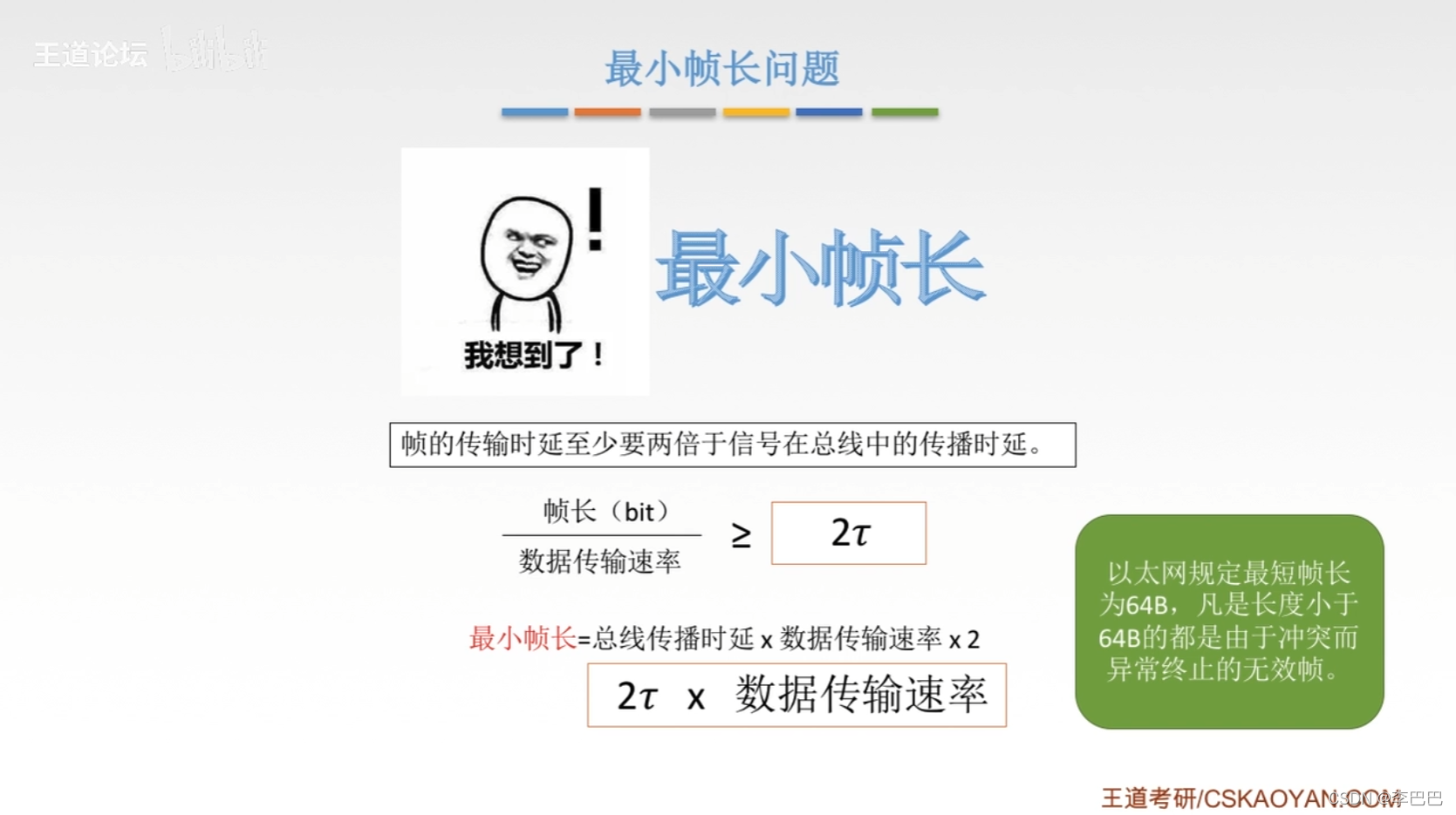 最小帧长是为了确保在检测到碰撞时,帧还没有发完。检测到碰撞的最短时间是2(tao)