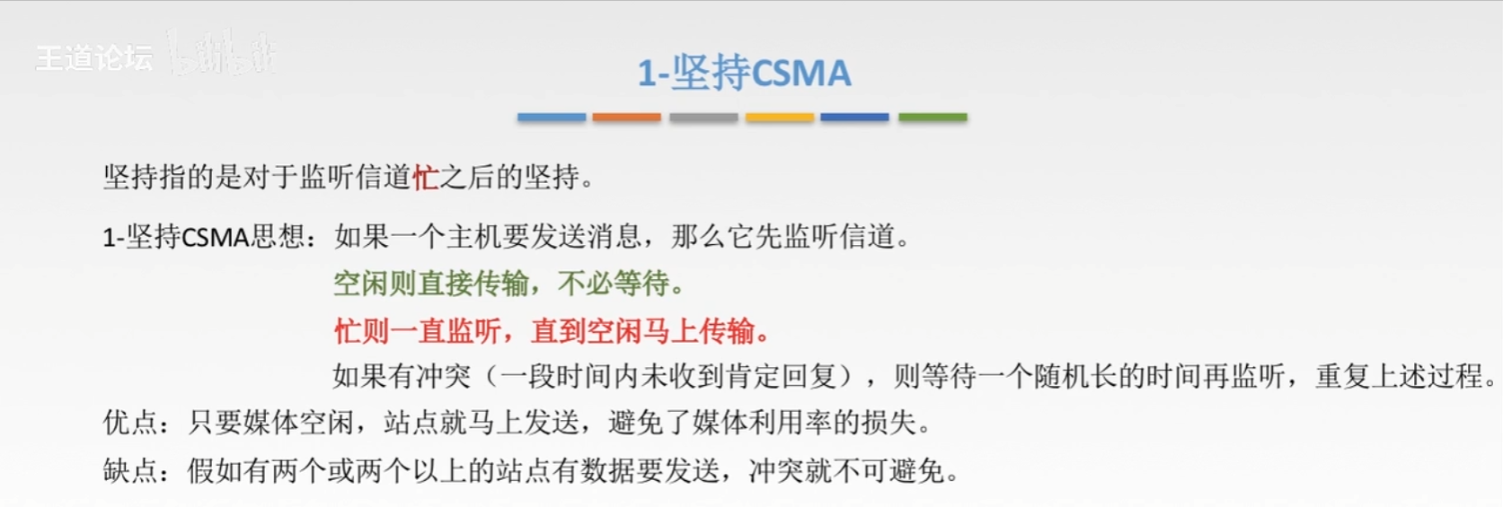 注:p-坚持CSMA是有的主机(p的概率)直接发送,有的主机(1-p的概率)监听到下一个时序再发送,降低了冲突的可能性