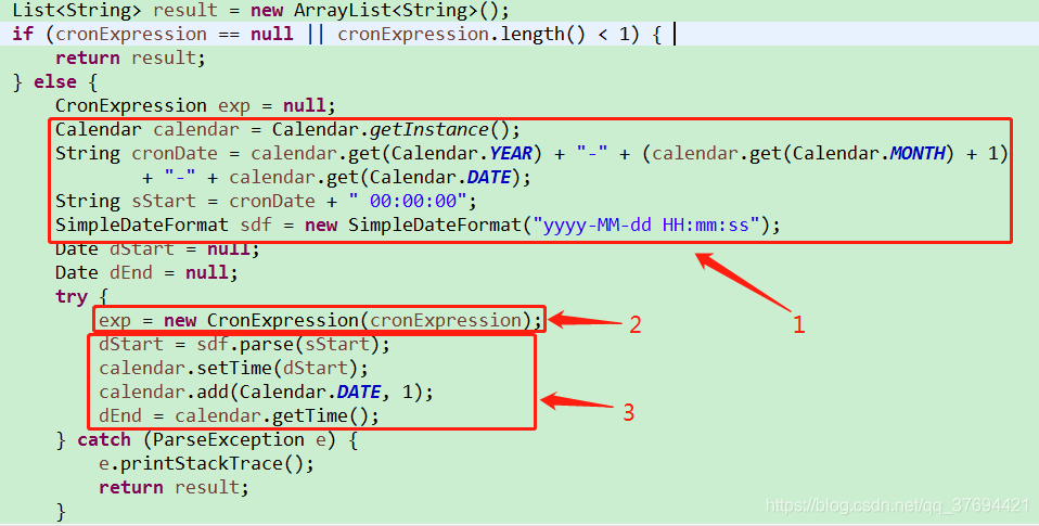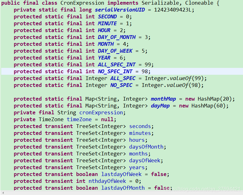 首先可以看到在进行cron表达式的非空判断后,我们定义了一个时间,这个时间是获取了当年当月当天之后与零点拼接在一起的,表示时间的查询是从当天零点开始;然后再try catch中我们调用了quartz包中的CronExpression类,可以看出他的作用是解析cron表达式中的各位置字符的含义。