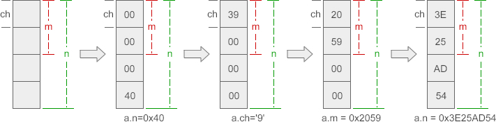 成员 n、ch、m 在内存中“对齐”到一头,对 ch 赋值修改的是前一个字节,对 m 赋值修改的是前两个字节,对 n 赋值修改的是全部字节。也就是说,ch、m 会影响到 n 的一部分数据,而 n 会影响到 ch、m 的全部数据。