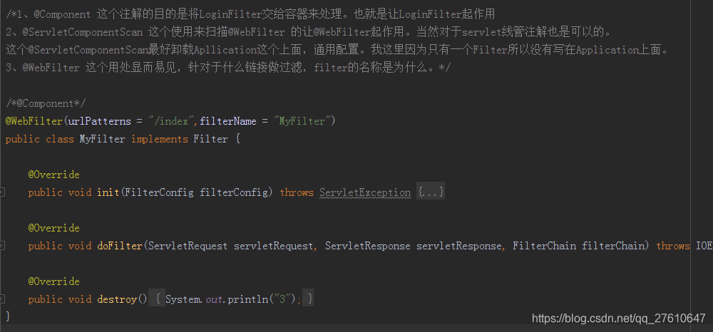 如果同时也加了Component注解,则Filter会运行两次,Component的作用就是讲Filter交个容器