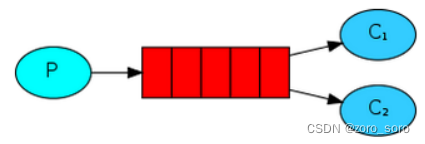 WORK模式: ⼀个⽣产者、2个消费者。 ⼀个消息只能被⼀个消费者获取。