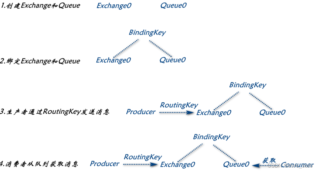 RoutingKey:路由键,Producer(生产者)将消息与路由键发送给Exchange(交换器),交换器对比Binding Key(绑定键)与Routing Key(路由键),将消息放到对应的Queen;