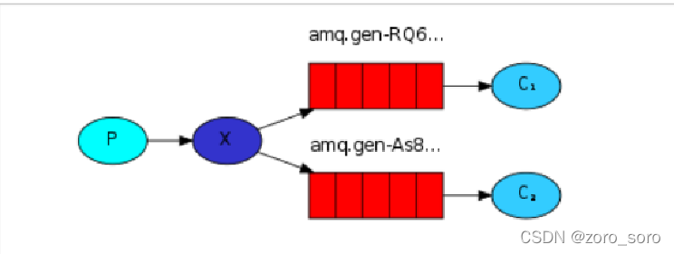 5、⽣产者发送的消息,经过交换机,到达队列,实现,⼀个消息被多个消费者获取的⽬的