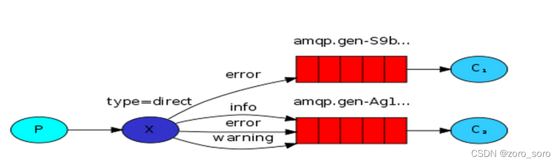 和订阅模式的区别在于,路由模式通过指定key来确认消息路由到那个队列;