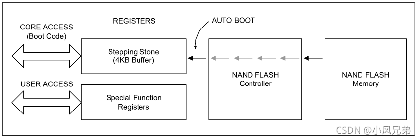 在复位过程中,Nand flash控制器通过引脚状态(NOCON(Adv flash),GPG13(页大小),GPG14(地址周期),GPG15(总线宽度))读取与其相连的NAND flash信息。系统上电或者复位时,NAND Flash控制器将会自动地将4Kb bootloader代码加载。加载完毕后,bootloader代码将会在“踏脚石”中执行。