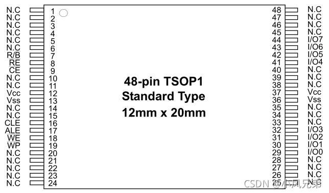 开发板中用到的Nand Flash型号是K9F2G08U0B。下图是引脚