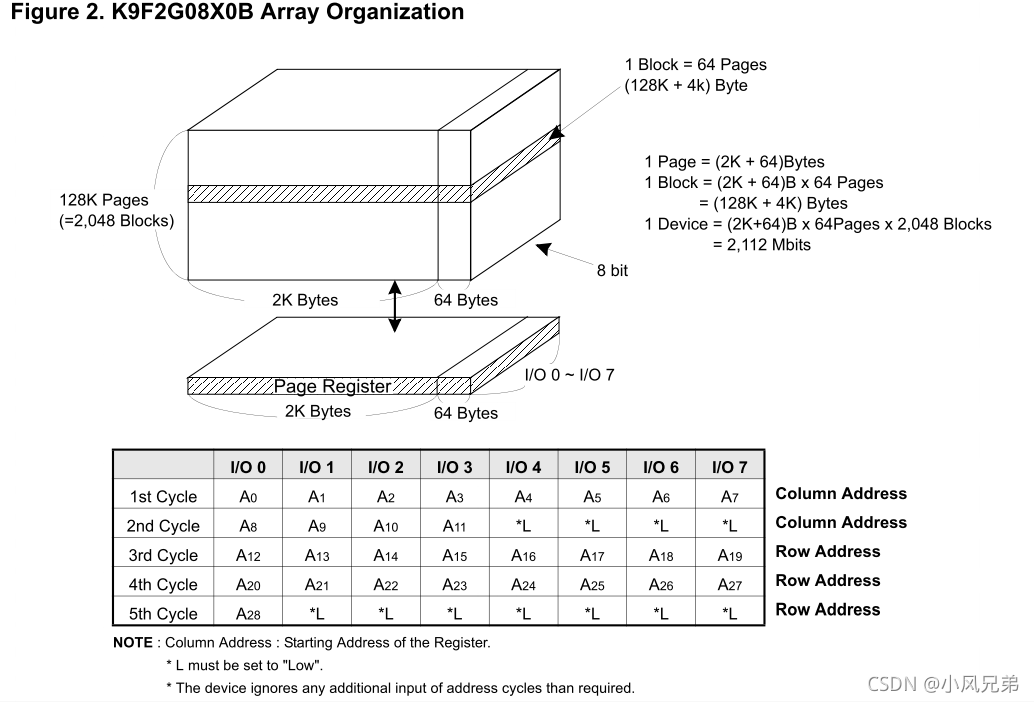 K9F2G08X0B共有2112Mbit约256M容量,由131072行(页)和2112×8列(页内索引)组成。空闲区(用于校验等非数据区)的 64×8列的列地址编号范围是2048~2111。一个2112字节的数据寄存器和存储器单元矩阵连接对应起来,用于在I/O缓存和存储器之间进行页读取和页写入。存储器矩阵是由32个单元以串行方式组成形成NAND结构。32个单元中的每一个分布在不同的页中。一个块由两个NAND连在一起构成。一个NAND结构由32个单元组成。一个块中共有1081344个NAND单元存在。 编程和读操做以页为基本单位进行操作,擦除操作是以块单位进行操作。存储器矩阵由2048个单独的128KB大小的可擦除块组成。在K9F2G08X0B上禁止按bit进行擦除操作。
