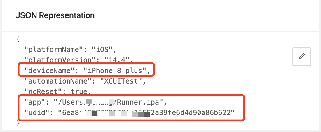 3. 配置”Desired Capabilities“信息,注意红框中的信息与iOS模拟器不一样。其中app要选择以”.ipa”为后缀名的包(直接使用xcode打包)