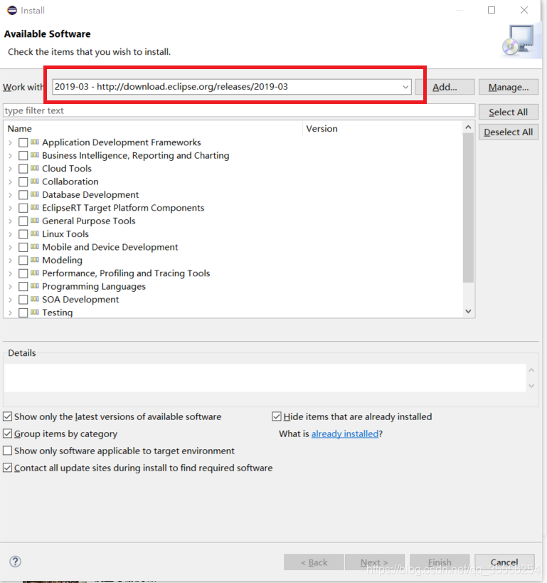2. 出现以下界面后,根据自己eclipse版本输入类似下图红色框中的地址: