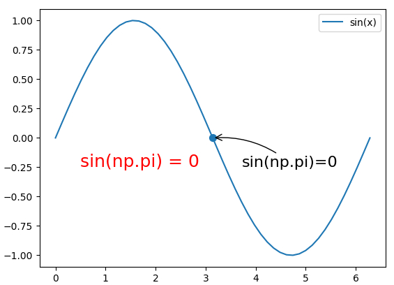 # 'sin(np.pi)=%s' % y0 代表标注的内容,可以通过字符串 %s 将 y0 的值传入字符串;