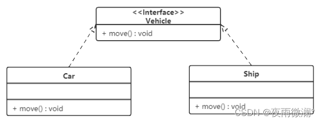 在 UML 类图中,实现关系使用带空心三角箭头的虚线来表示,箭头从实现类指向接口。例如,汽车和船实现了交通工具,其类图如图 9 所示。