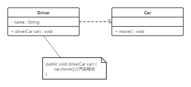 在 UML 类图中,依赖关系使用带箭头的虚线来表示,箭头从使用类指向被依赖的类。下图所示是司机和汽车的关系图,司机驾驶汽车: