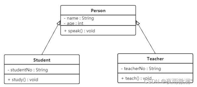 在 UML 类图中,泛化关系用带空心三角箭头的实线来表示,箭头从子类指向父类。在代码实现时,使用面向对象的继承机制来实现泛化关系。例如,Student 类和 Teacher 类都是 Person 类的子类,其类图如下图所示:
