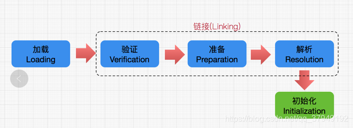:类加载最后阶段,若该类具有超类,则对其进行初始化,执行静态初始化器和静态初始化成员变量(如前面只初始化了默认值的static变量将会在这个阶段赋值,成员变量也将被初始化)。