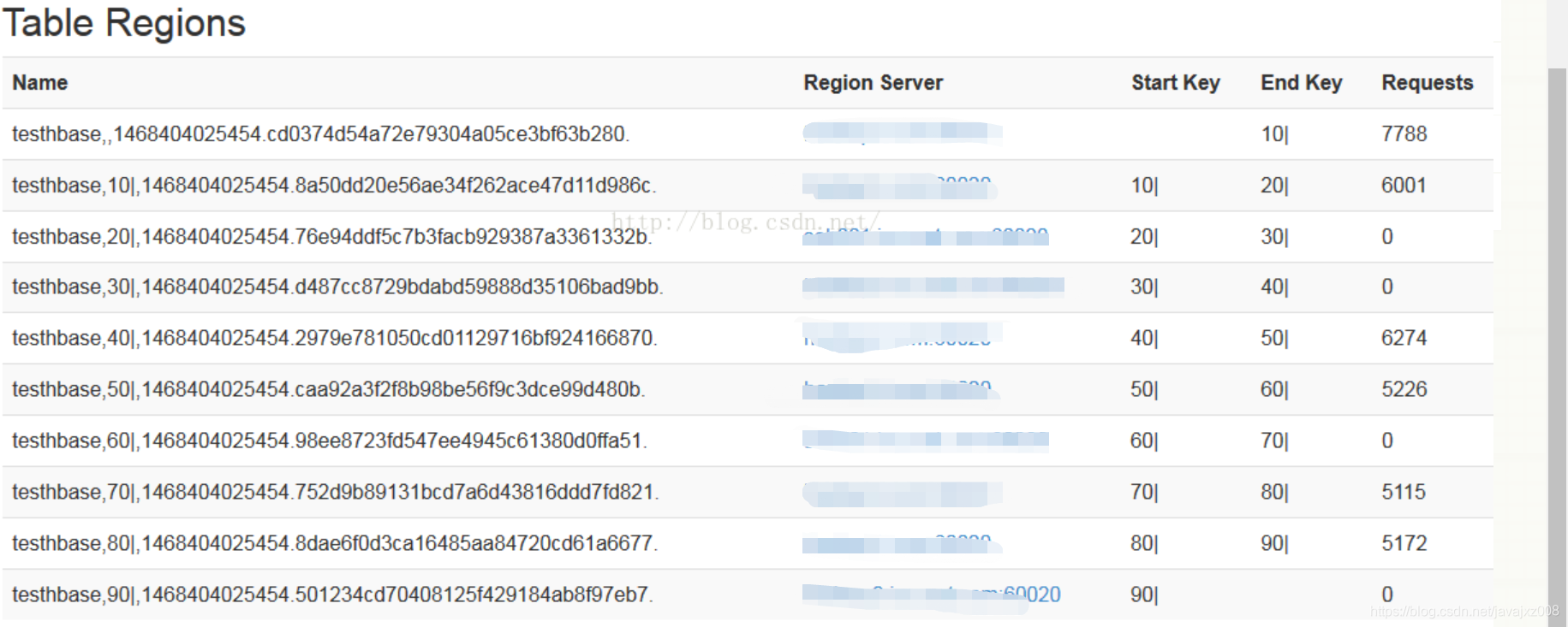 从上图可看出10个region均匀的分布在了3台regionserver上(集群就3台机器regionserver),达到预期效果。还可以在hbase的web UI界面中更加直观的查看建表的预分区信息。
