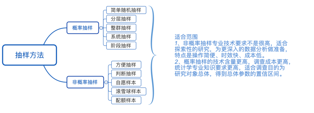 •概率抽样的技术含量更高,调查成本更高,统计学专业知识要求更高,适合调查目的为研究对象总体,得到总体参数的置信区间。