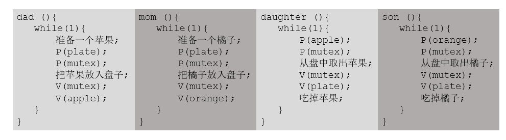 桌子上有一只盘子,每次只能向其中放入一个水果。爸爸专向盘子中放苹果,妈妈专向盘子中放橘子,儿子专等着吃盘子中的橘子,女儿专等着吃盘子中的苹果。只有盘子空时,爸爸或妈妈才可向盘子中放一个水果。仅当盘子中有自己需要的水果时,儿子或女儿可以从盘子中取出水果。