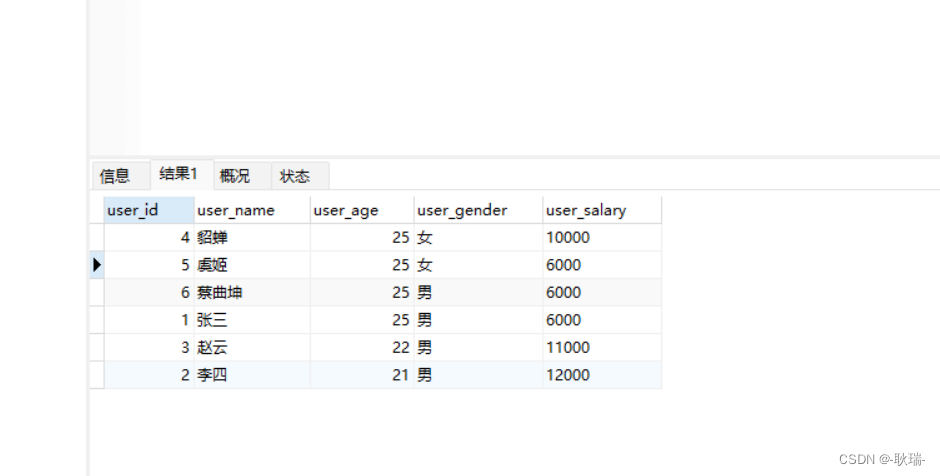 然后采用第二个排序规则 user_salary升序排序 因为貂蝉在25岁员工 中 user_salary最大 因此到了最后