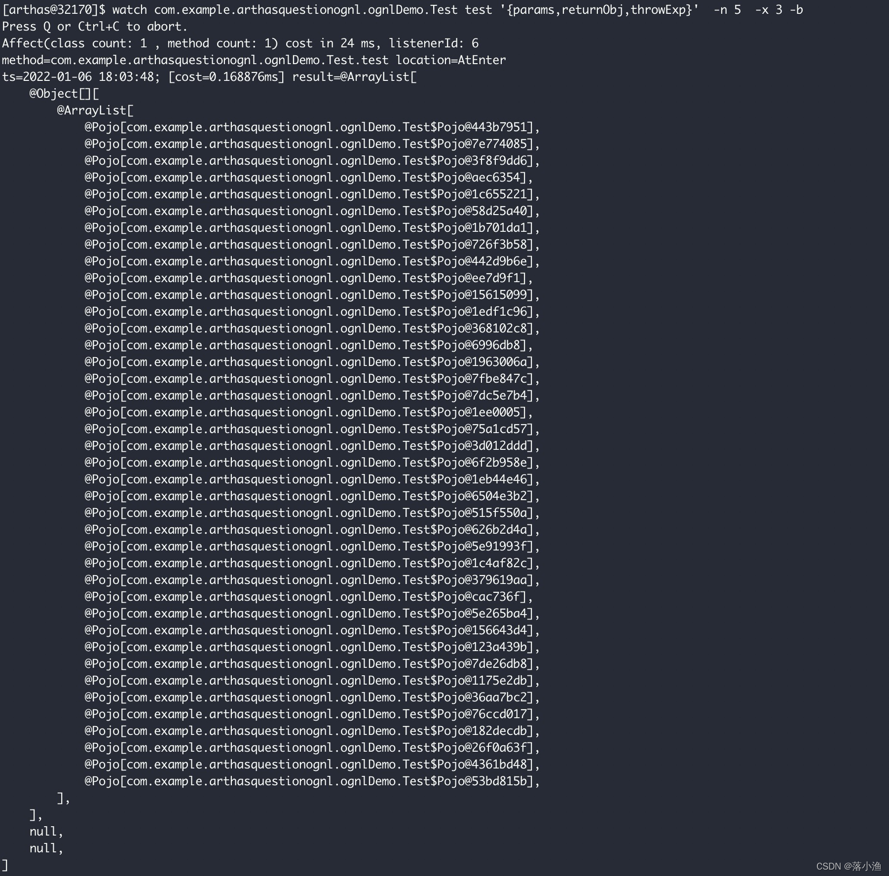 [arthas@30992]$ watch com.example.arthasquestionognl.ognlDemo.Test test params[0][0] -n 1 Press Q or Ctrl+C to abort. Affect(class count: 1 , method count: 1) cost in 13 ms, listenerId: 3 method=com.example.arthasquestionognl.ognlDemo.Test.test location=AtExit ts=2022-01-06 17:16:08; [cost=0.074507ms] result=@Pojo[ name=@String[name 0], age=@Integer[2], hobby=null, ] Command execution times exceed limit: 1, so command will exit. You can set it with -n option. [arthas@30992]$ watch com.example.arthasquestionognl.ognlDemo.Test test params[0].get(0) -n 1 Press Q or Ctrl+C to abort. Affect(class count: 1 , method count: 1) cost in 14 ms, listenerId: 4 method=com.example.arthasquestionognl.ognlDemo.Test.test location=AtExit ts=2022-01-06 17:16:29; [cost=0.093399ms] result=@Pojo[ name=@String[name 0], age=@Integer[2], hobby=null, ]查看Pojo的属性