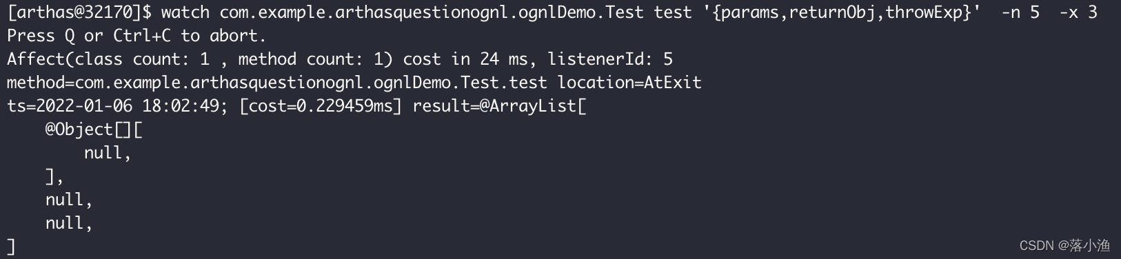 :[arthas@30992]$ watch com.example.arthasquestionognl.ognlDemo.Test test params[0][0]["age"] -n 1 Press Q or Ctrl+C to abort. Affect(class count: 1 , method count: 1) cost in 19 ms, listenerId: 7 watch failed, condition is: null, express is: params[0][0][age], ognl.NoSuchPropertyException: com.taobao.arthas.core.advisor.Advice.age, visit /Users/luoyu/logs/arthas/arthas.log for more details.这样会报错,这个时候需要加一个单引号