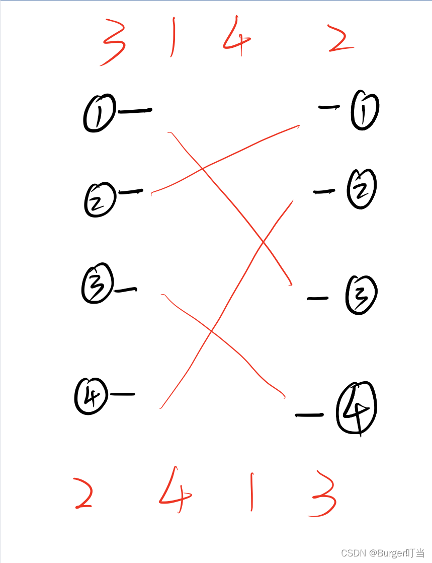 以四个触点为例,在正向传播时,我们以左面触点为基准,读取右面触点的序号为3 4 1 2,在反向传播时,我们以右面触点为基准,读取左面触点序号为2 4 1 3。如何根据3412来构建出2413是一个关键。笔者的一个朋友提供了一个很好的思路。假设3412储存在列表A中,对列表A进行从小到大的排序,储存在列表B中。将列表B中每一个元素在列表A中的下标记录到列表C中,列表C即为我们所求。