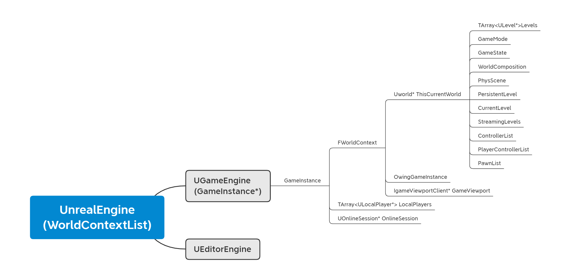 而用来管理World的是WorldContext,从一个World切换到另一个比如说从编辑器的预览切换到PIE的时候,FWorldContext就用来保存切换过程和World上下文信息。一个World只有一个PersistentLevel,比如切换Level的时候,也会需要WorldContext参数,因为UE在切换PersistentLevel的时候其实是卸载一个World再加载一个新的。