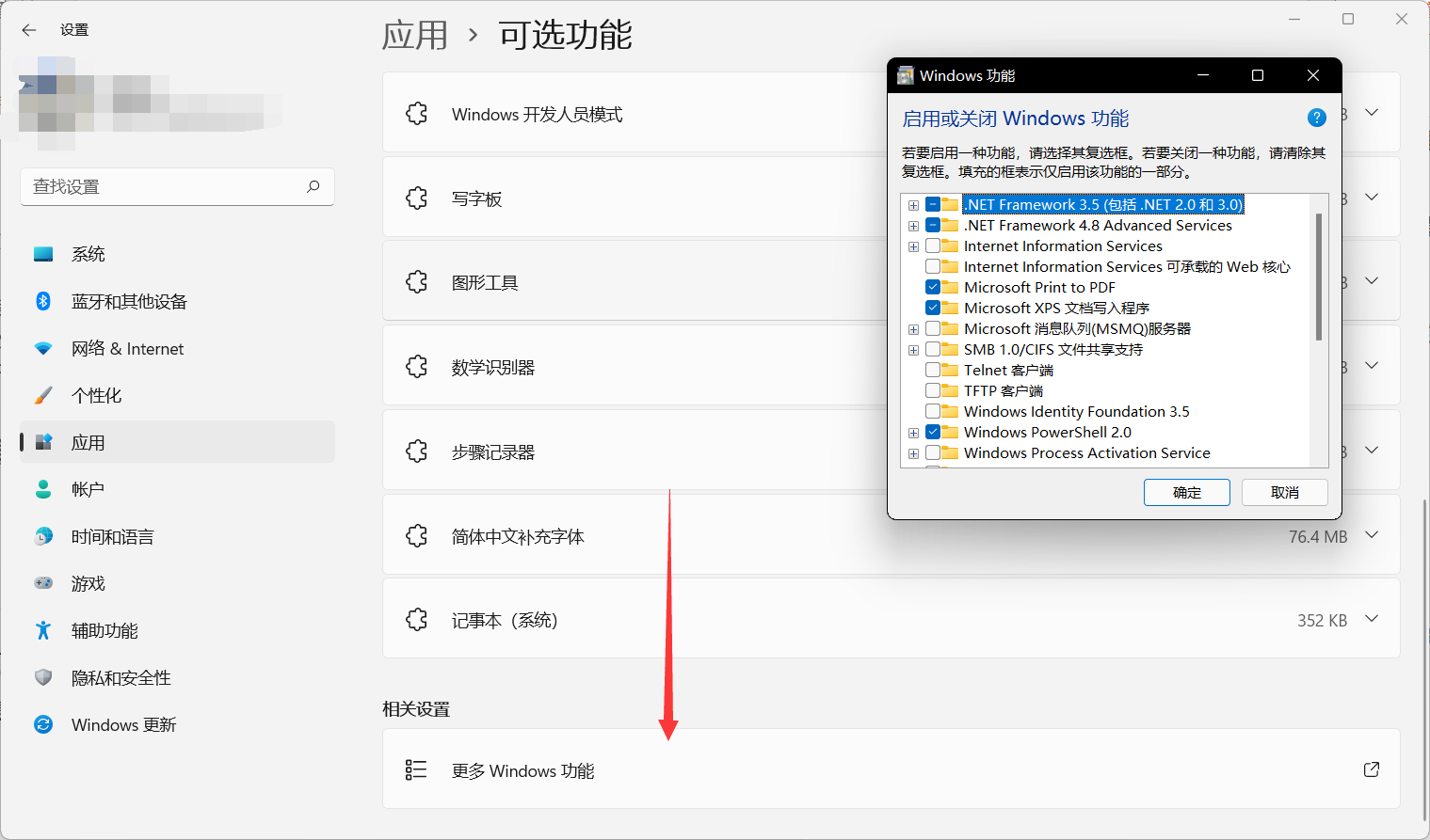 设置 > 应用 > 可选功能