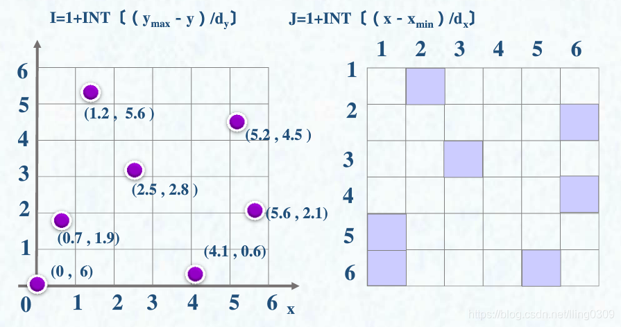矢量数据中的点坐标用X、Y来表示,而在栅格数据中,像元的行、列号用I、J来表示。设O为矢量数据的坐标原点,O′(Xo,Yo)为栅格数据的坐标原点。A为制图要素的任一点,则该点在矢量和栅格数据中可分别表示为(X,Y)和(I,J)。 DX、DY分别表示一个栅格的宽和高,[]表示取整。