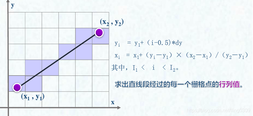 折线或曲线是直线段的组成或逼近的。假设某一线段两端点的坐标为(x1,y1),(x2,y2),且y2>y1。线段两端点所在栅格的行列号分别为I1,J1和I2,J2,点(xi,yi)为直线段经过的中间栅格的水平中心线与直线段交点的坐标