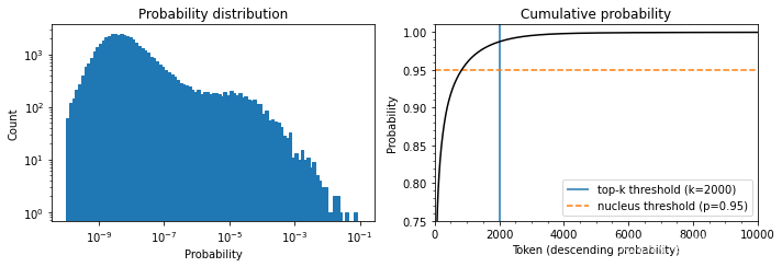 #caption Probability distribution of next token prediction (left) and cumulative distribution of descending token probabilities