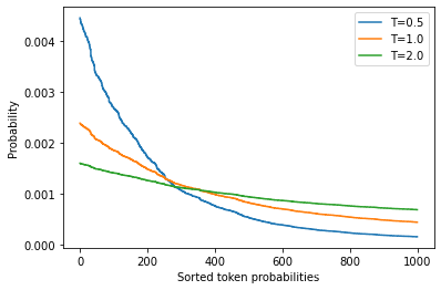在下图中,我们按概率降序排列标记,并计算前10,000个标记的累积总和(GPT-2的词汇中总共有50,257个标记)。弧线代表挑选前面任何一个标记的概率。例如,在概率最高的1,000个标记中,大约有96%的机会挑选任何一个标记。我们看到,该概率迅速上升到90%以上,但在几千个标记之后才饱和,接近100%。该图 显示,有1/100的概率没有选到任何甚至不在前2000名的标记。