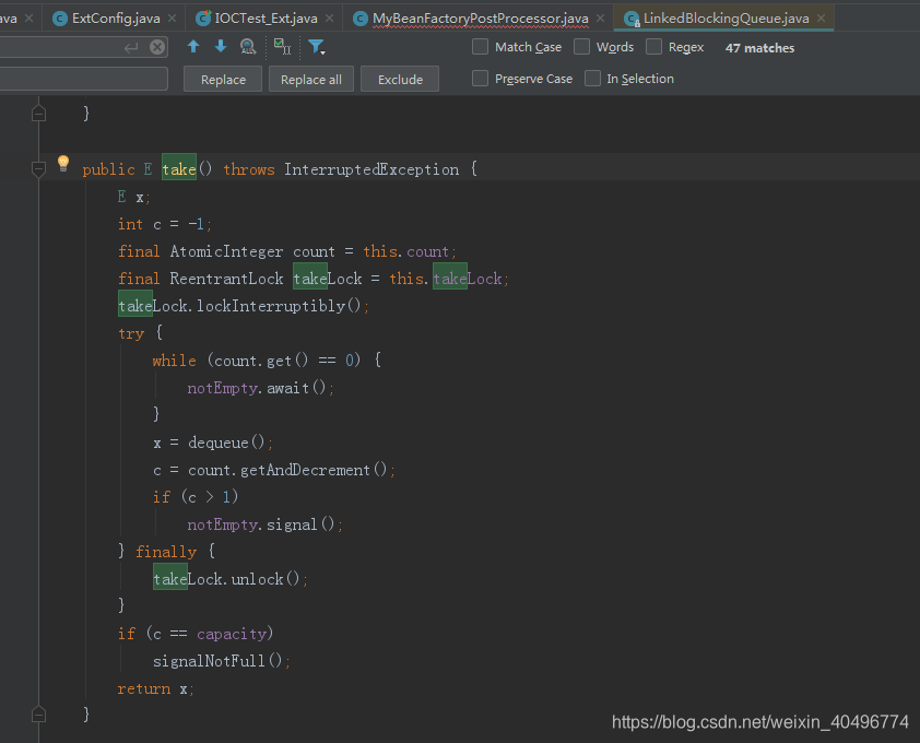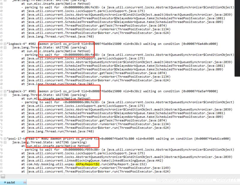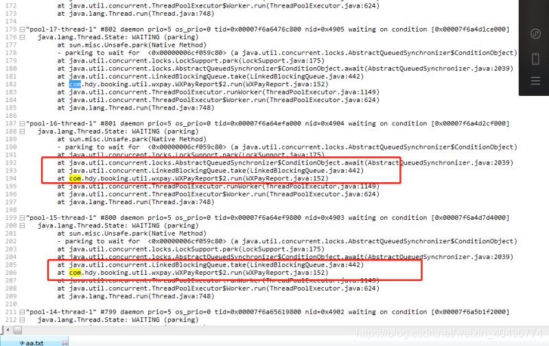 然后搜索到WXPayReport这个类,发现有一段是一个多线程在跑,然后调用了队列的一个take方法,