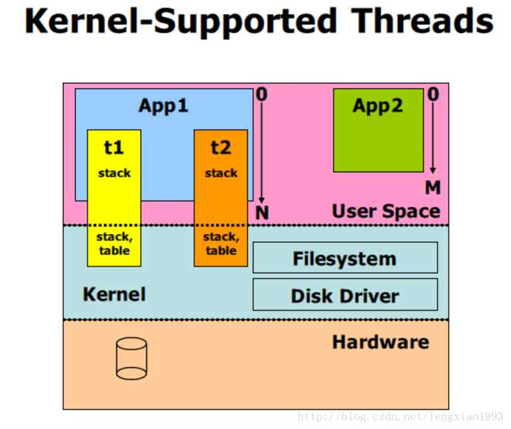 - 操作系统内核能够感知到线程, 每一个线程都会有一个内核调用栈(kenerl stack) 和 保存CPU 寄存器下文的 table 。