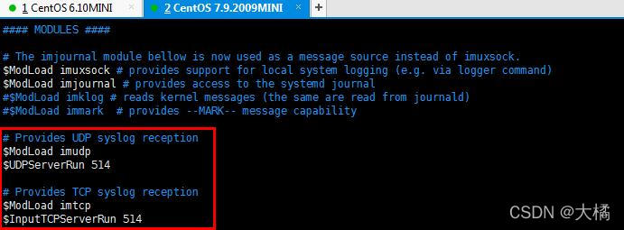 编辑MODULES段,开启端口监听。一定记着防火墙,firewall-cmd要么关闭,要么允许514通过。