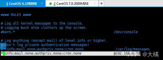 编辑RULES段,把之前传给messages日志文件的内容,定向到centos7(192.168.0.79)。