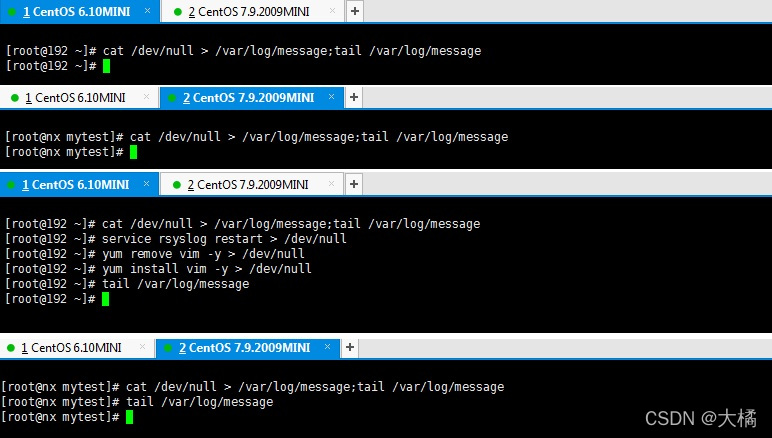 cat /dev/null > /var/log/messages;tail /var/log/messages:清空日志,没有任何内容。