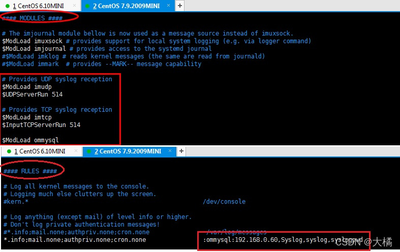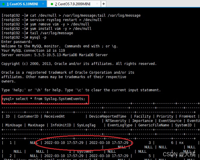 centos6.10(192.168.0.60)、centos7.9(192.168.0.79)、rsyslog、mairadb。为了好记,所以ip地址对应centos版本号。两个系统上都有mariadb(mysql)。