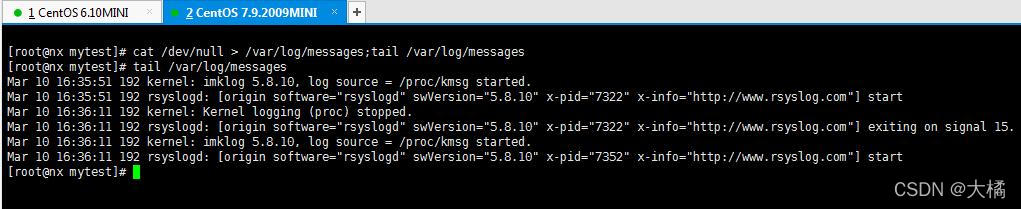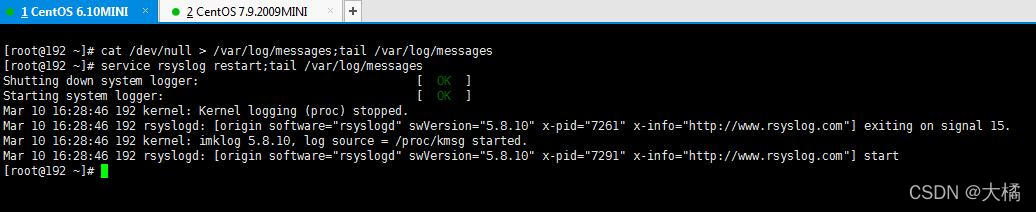 service rsyslog restart;tail /var/log/messages:输出重启rsyslog服务产生的日志。