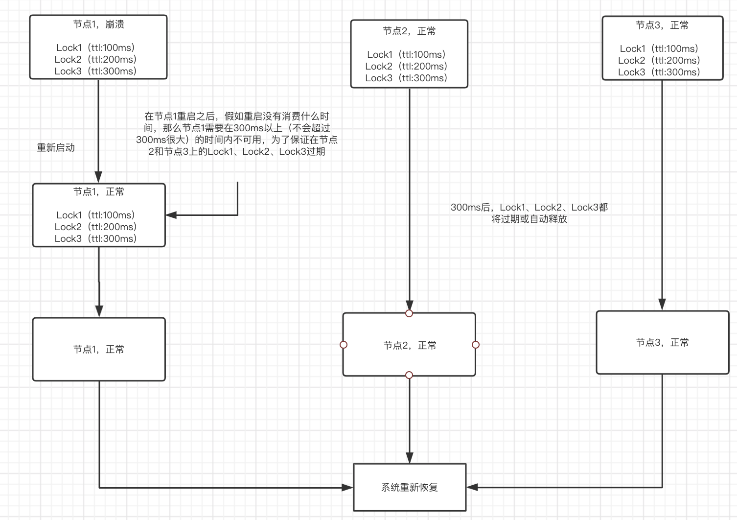 但是,情况总比乍看之下要好。只要节点在崩溃后重新启动,它就不再参与任何当前活动的Lock(将该节点在锁的持有计算上排除),算法安全性就得以保留;即在所有可用节点上进行锁的实例获取,正在重启的节点不参与计算。为了保证这一点,我们需要在崩溃节点上的所有锁的最大的过期时间还要稍微大一点时间的窗口期,该崩溃节点不可用,为了保证在该节点上的锁在其他节点上已经失效或者自动过期。如下图所示: